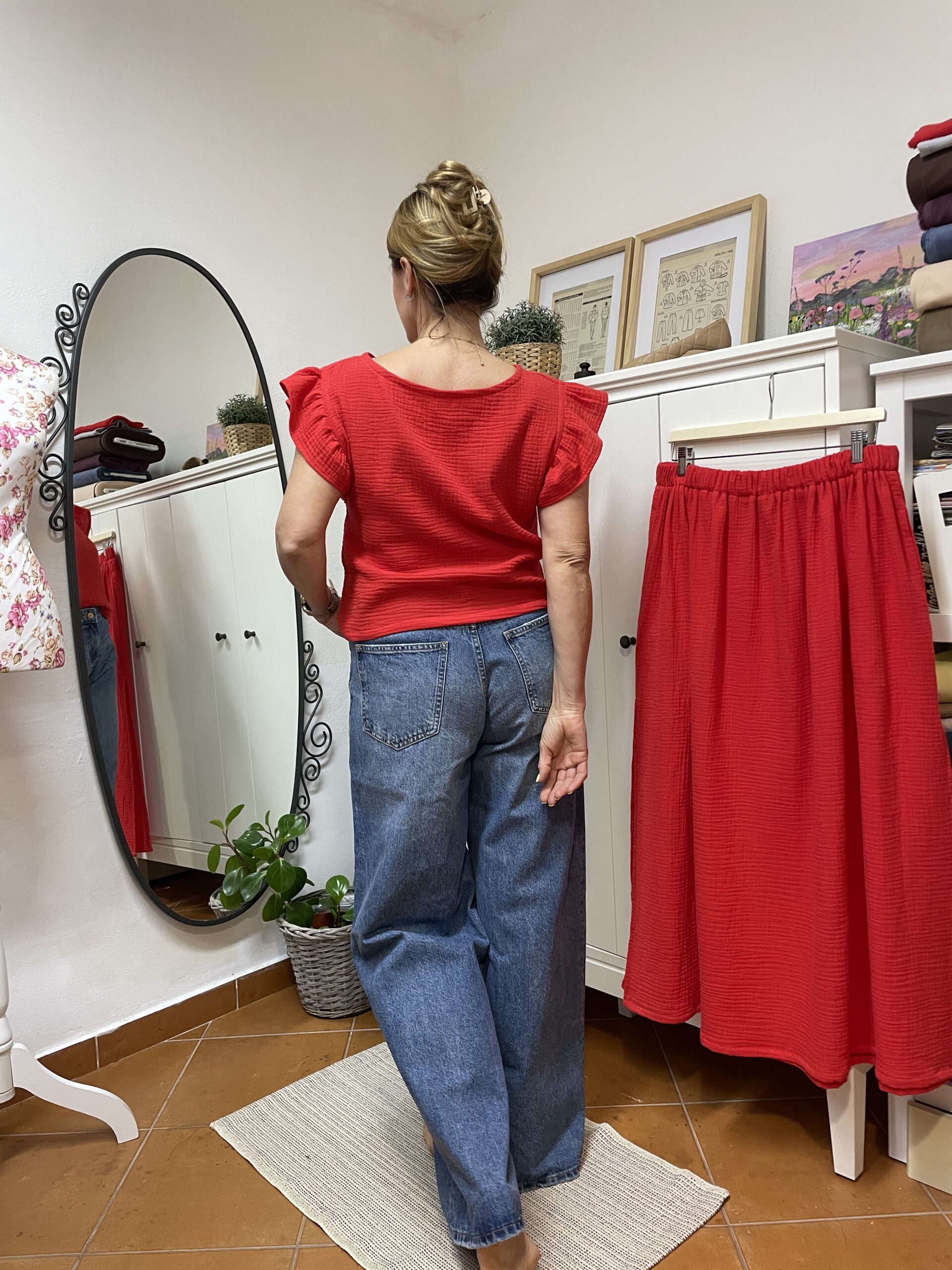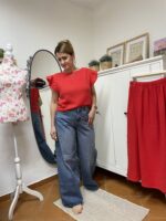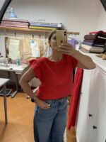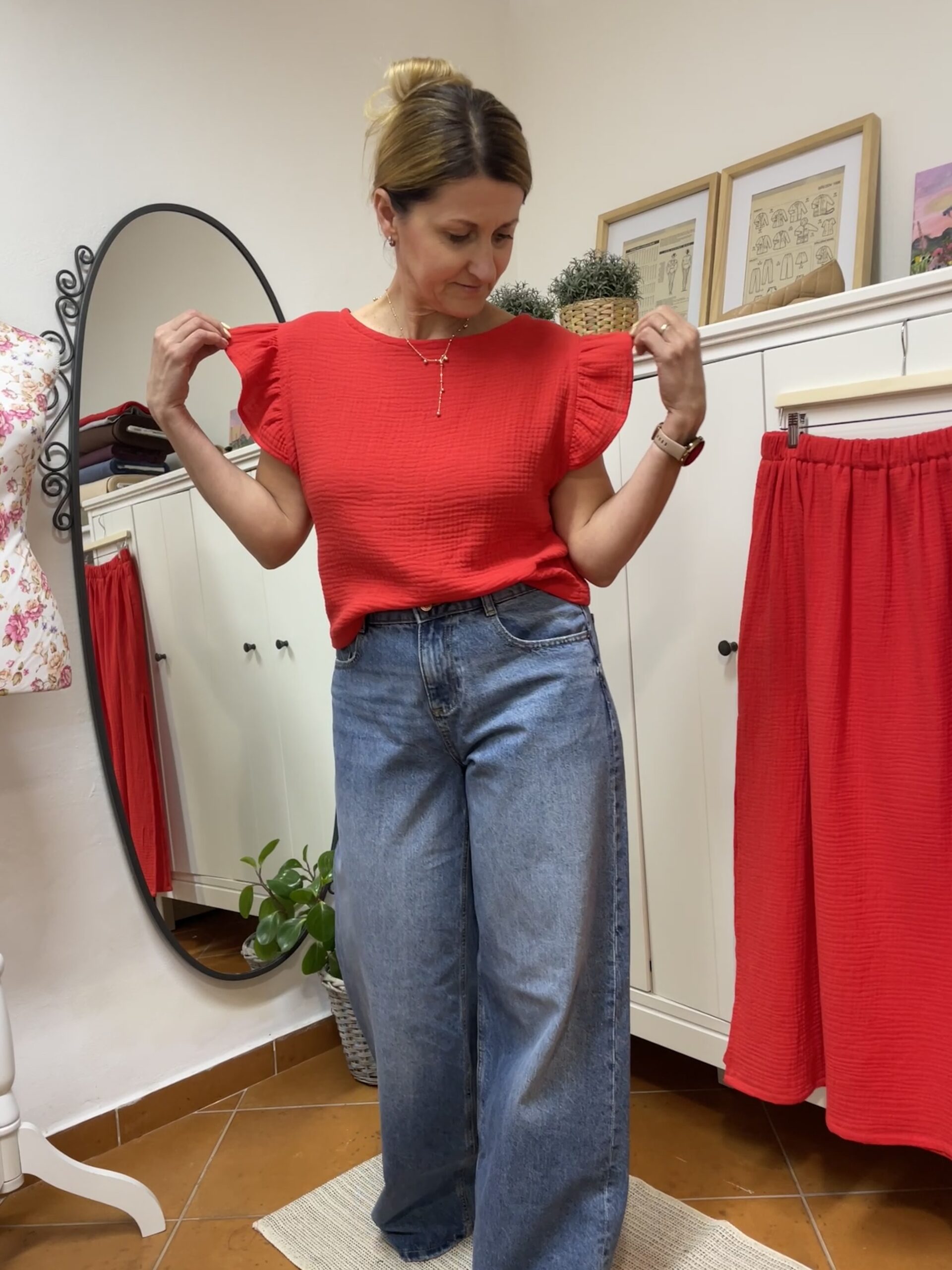 Volánkový rukáv dodává halence měkkost a lehkost, zatímco čistý střih umožňuje snadné kombinování – s džínami pro každodenní nošení i se sukní pro klidnější, ženský outfit.