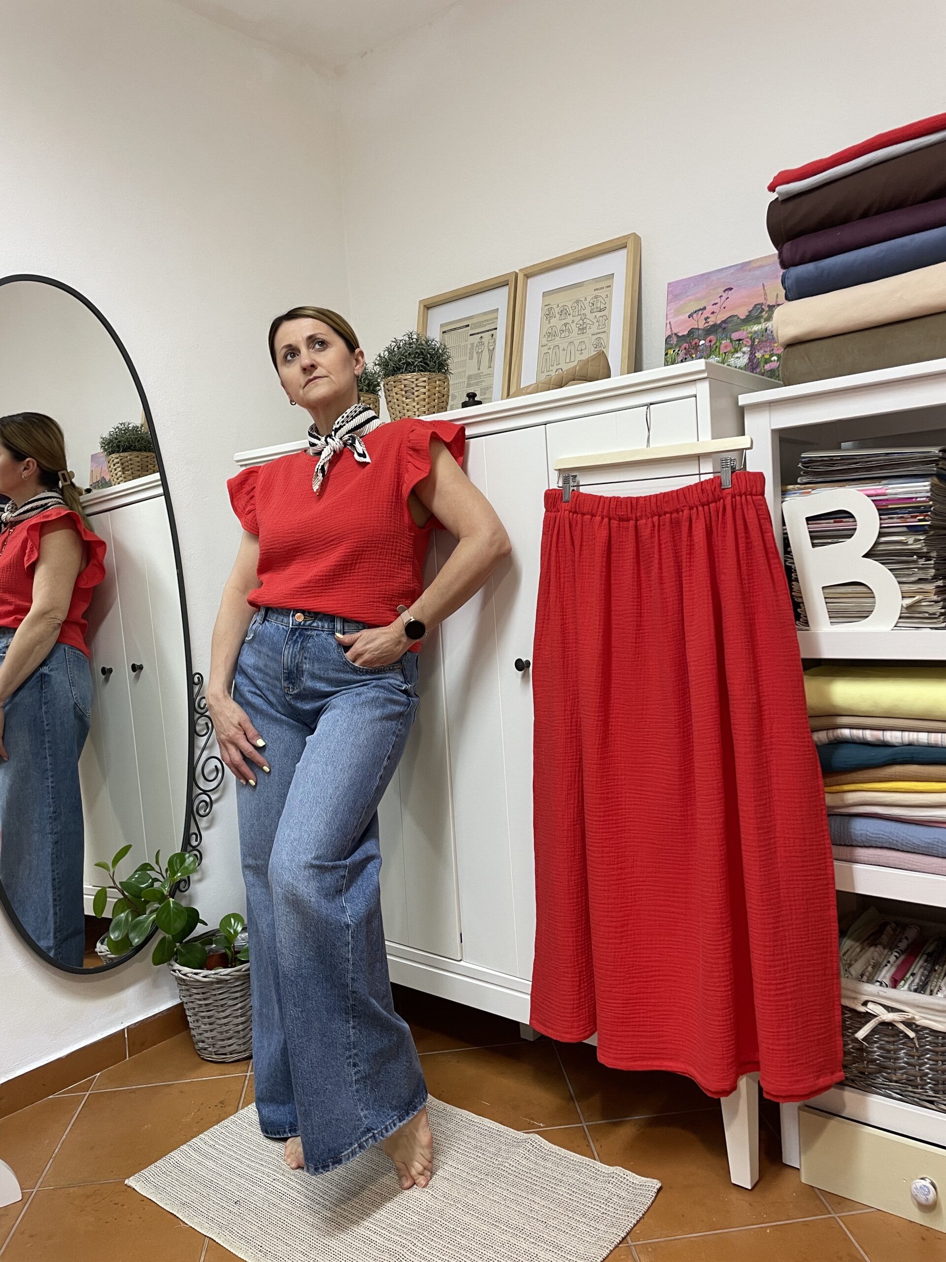 (Volný střih). Rozměry (vel. S 36/38): Obvod přes prsa: 2 x 51 cm.  Délka blůzy: 48 cm. Další uvedené velikosti: L 40/42 – obvod přes prsa 2 x 55 cm