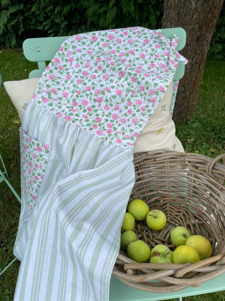 Romantická, něžná, jako stvořená pro pomalé letní dny. Zdobená drobnými růžičkami a doplněná o jemné zelenobílé pruhy. Praktická kapsa na nezbytnosti a pohodlný střih dělají z Elišky zástěrku, kterou nebudete chtít sundat.