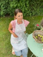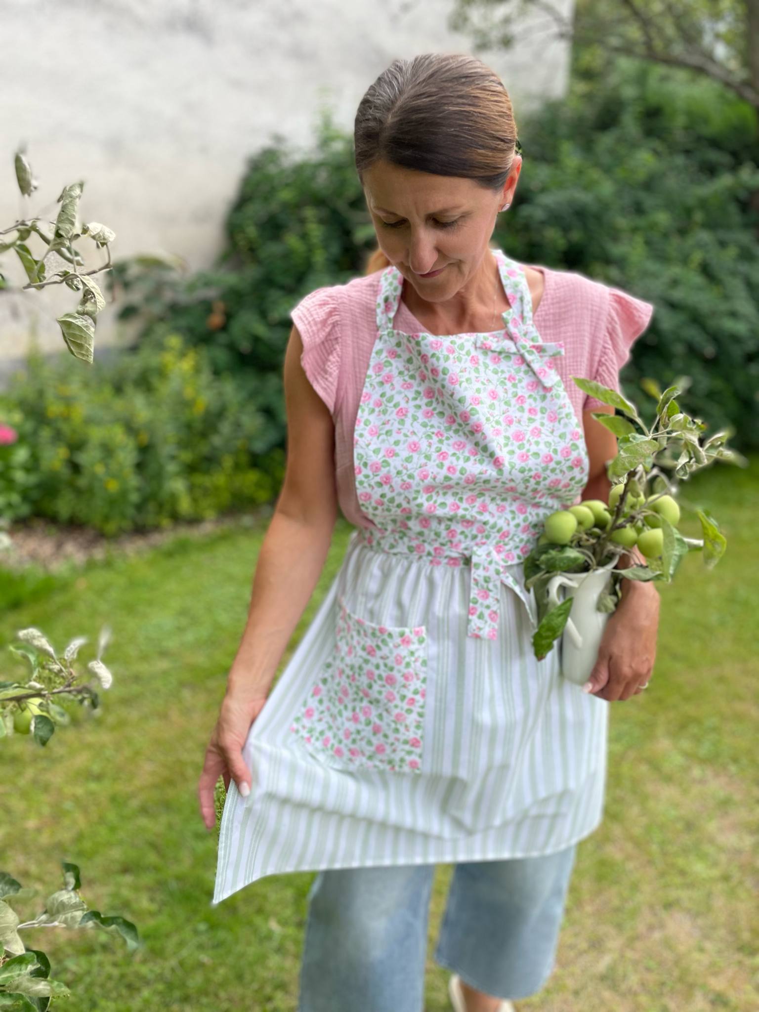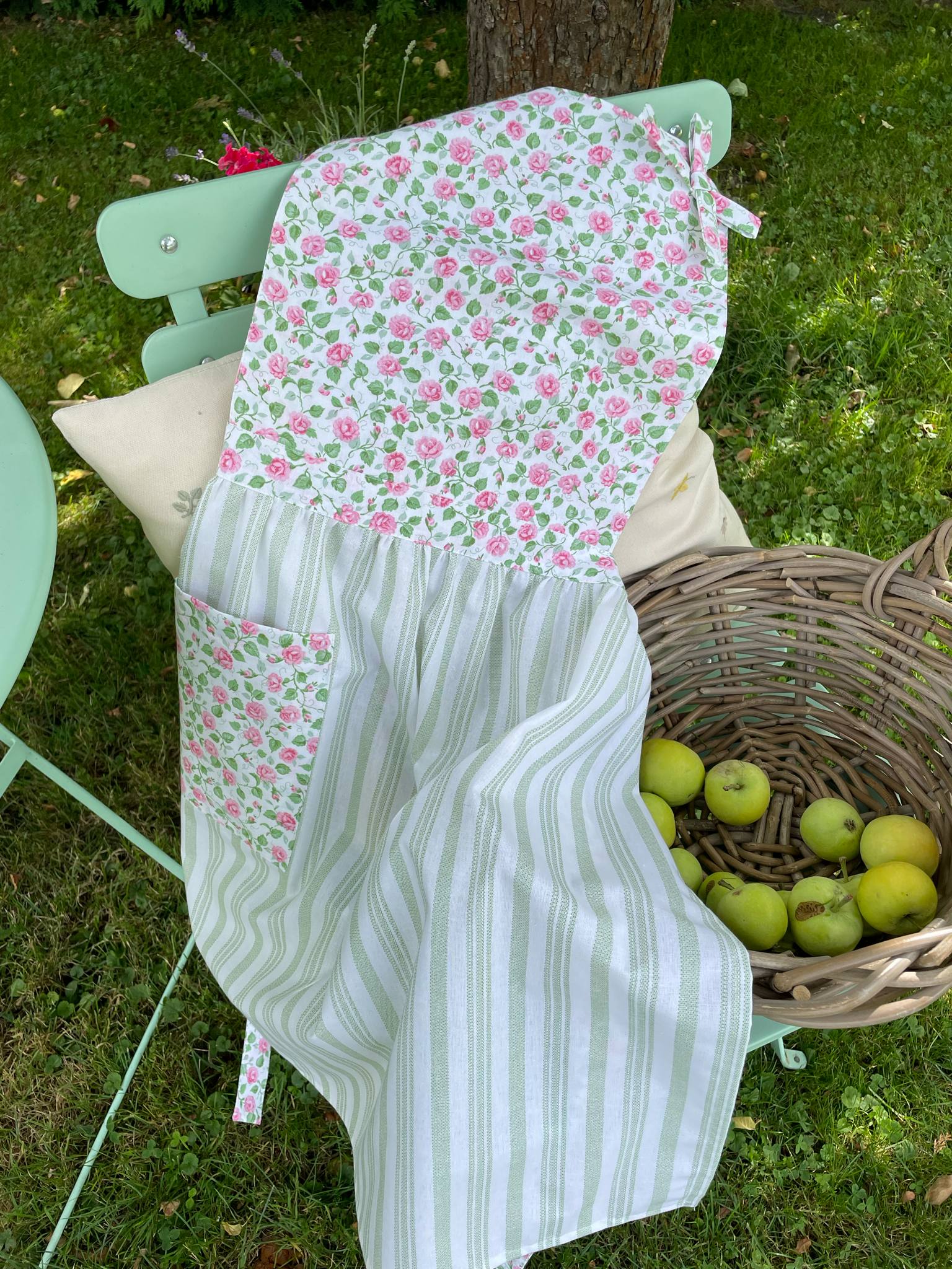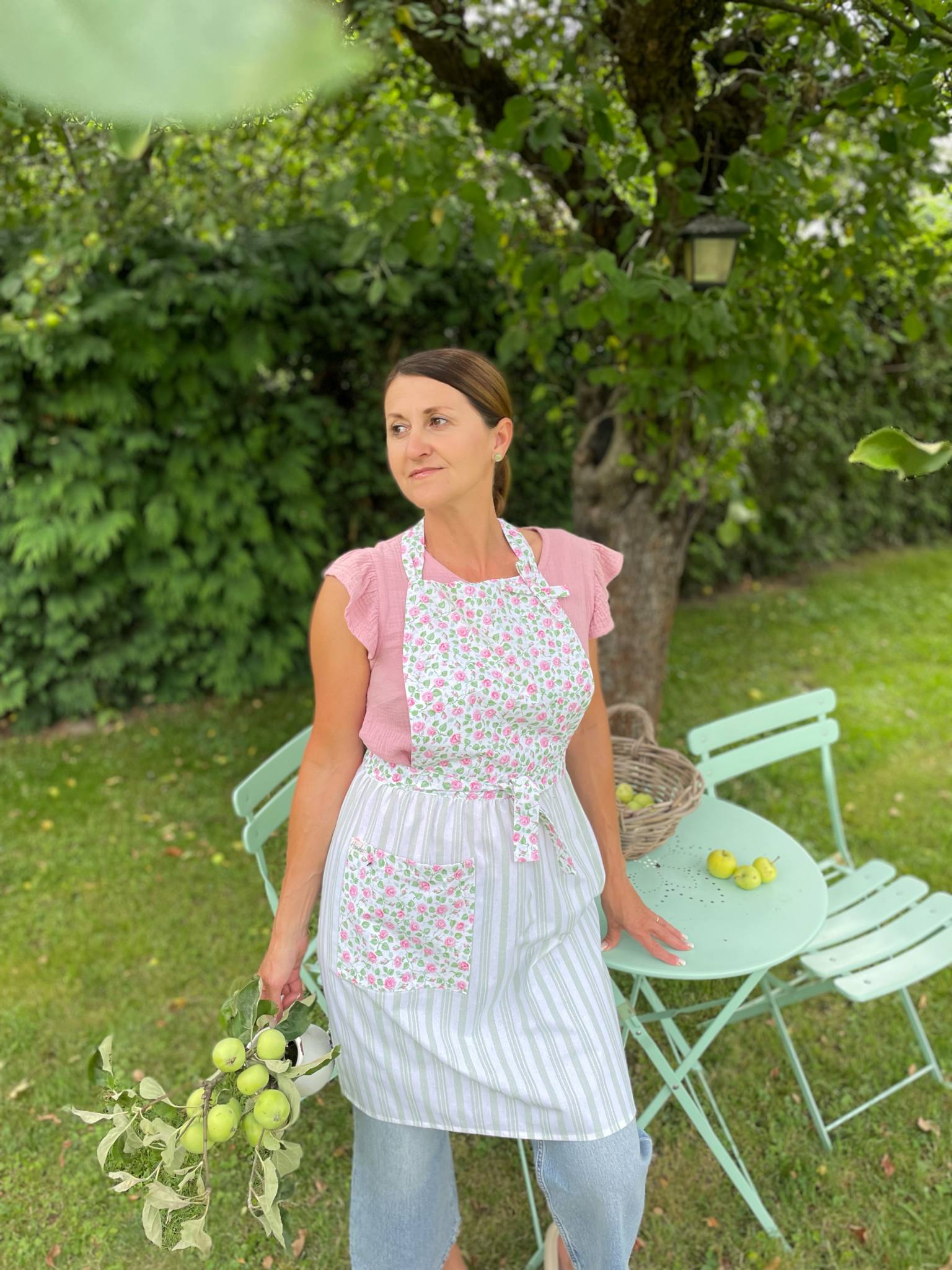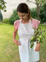 Romantická, něžná, jako stvořená pro pomalé letní dny. Zdobená drobnými růžičkami a doplněná o jemné zelenobílé pruhy. Praktická kapsa na nezbytnosti a pohodlný střih dělají z Elišky zástěrku, kterou nebudete chtít sundat.