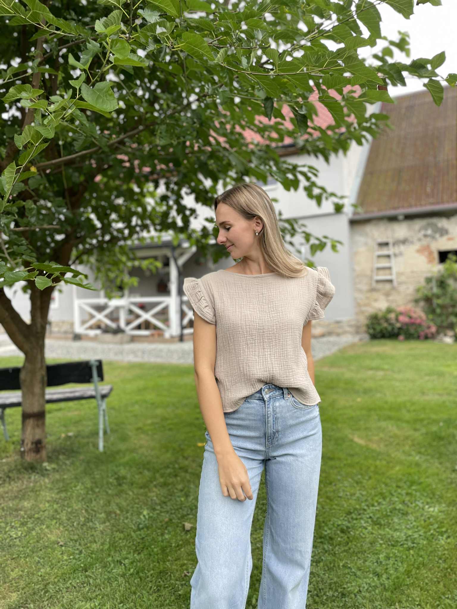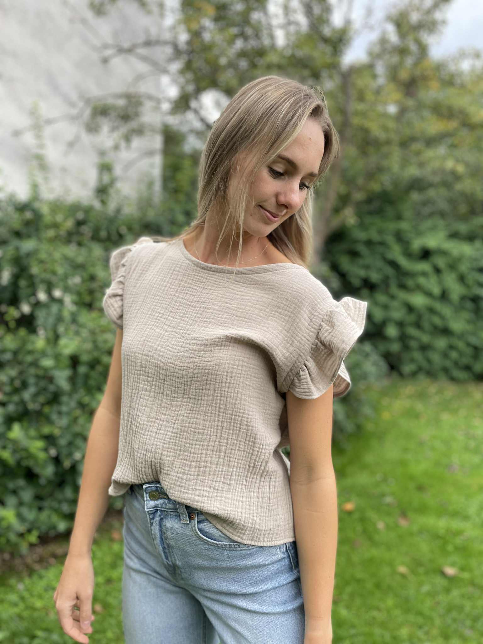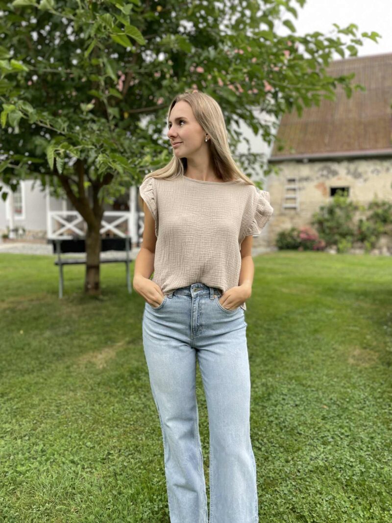 Vdechněte do svého šatníku svěžest s touto romantickou halenkou ve žluté barvě. Vyrobena z příjemného mušelínu, který je lehký, vzdušný. Delikátní volánky na rukávech dodávají halence hravost a ženskost. Je to perfektní volba pro ležérní, ale elegantní outfit, který vám poskytne pohodlí po celý den. Skvěle se kombinuje s kraťasy i dlouhými kalhotami – je to ideální kousek pro každodenní nošení i speciální příležitosti. Dopřejte si kousek, ve kterém se budete cítit svěže a přirozeně krásně.