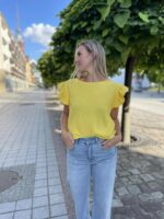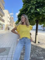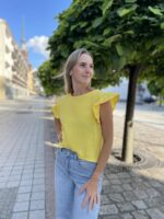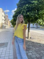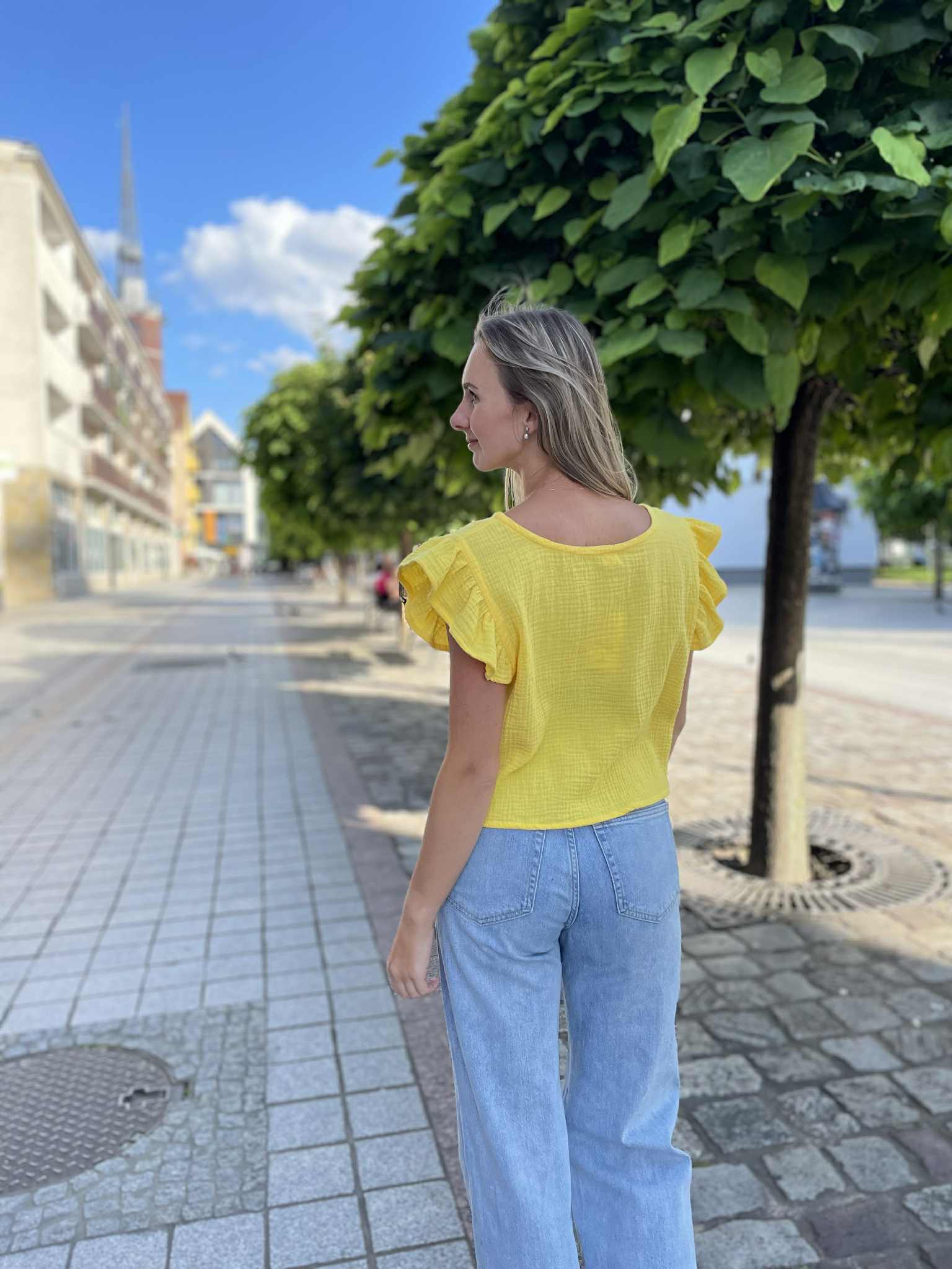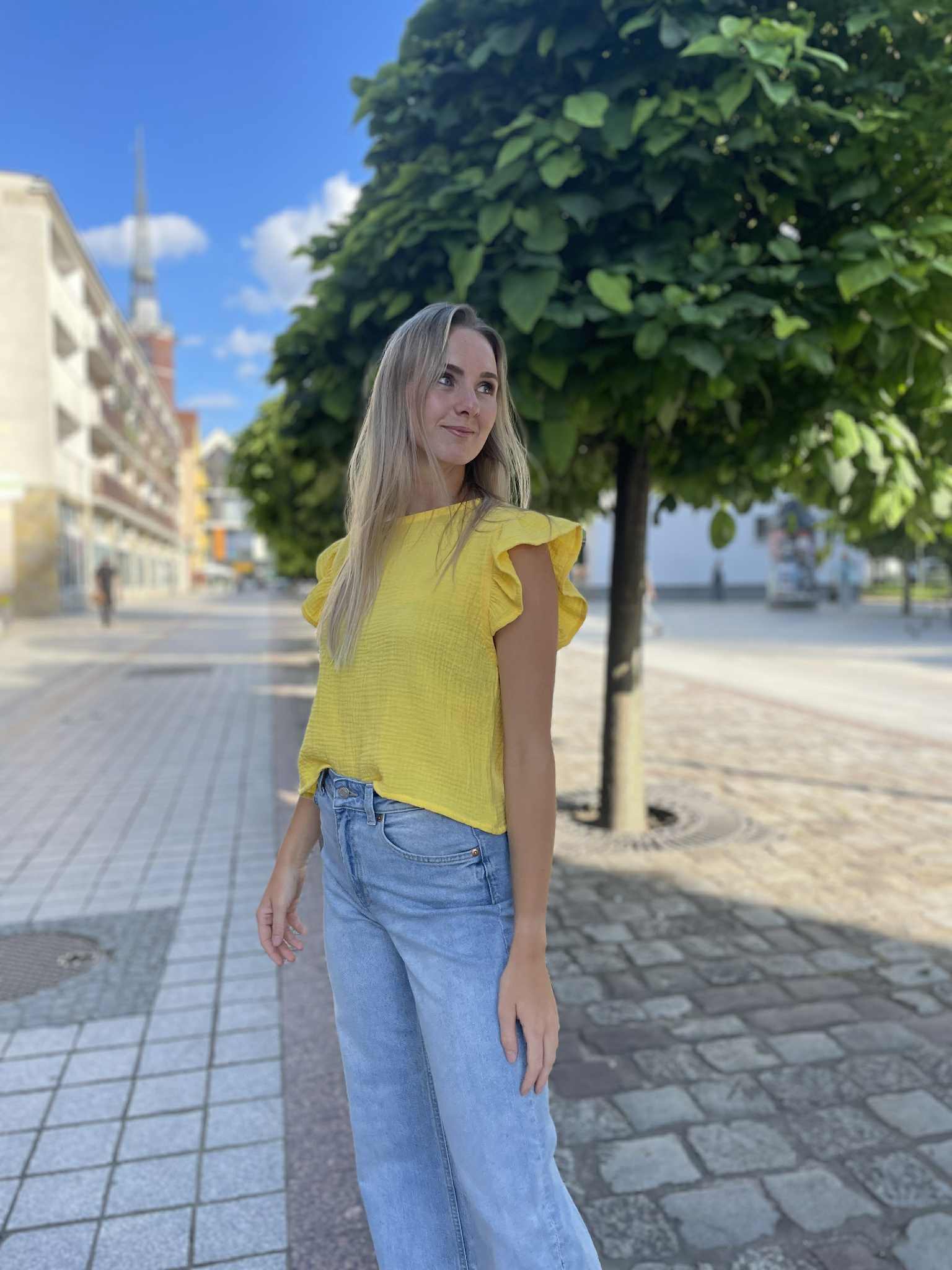 Vdechněte do svého šatníku svěžest s touto romantickou halenkou ve žluté barvě. Vyrobena z příjemného mušelínu, který je lehký, vzdušný. Delikátní volánky na rukávech dodávají halence hravost a ženskost. Je to perfektní volba pro ležérní, ale elegantní outfit, který vám poskytne pohodlí po celý den. Skvěle se kombinuje s kraťasy i dlouhými kalhotami – je to ideální kousek pro každodenní nošení i speciální příležitosti. Dopřejte si kousek, ve kterém se budete cítit svěže a přirozeně krásně.