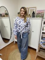 Bílá halenka s většími květy přináší do vašeho šatníku styl i pohodlí.