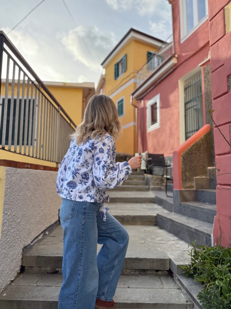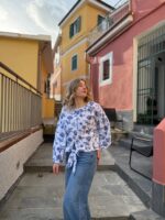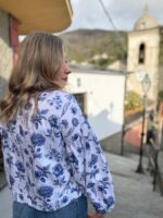Dámská halenka s květovaným motivem modrobílé kombinaci je kouskem, který v sobě spojuje ženkost, pohodlí a nadčasový styl. Jemný kulatý límeček dodává halence měkký romantický nádech a nabírané rukávy