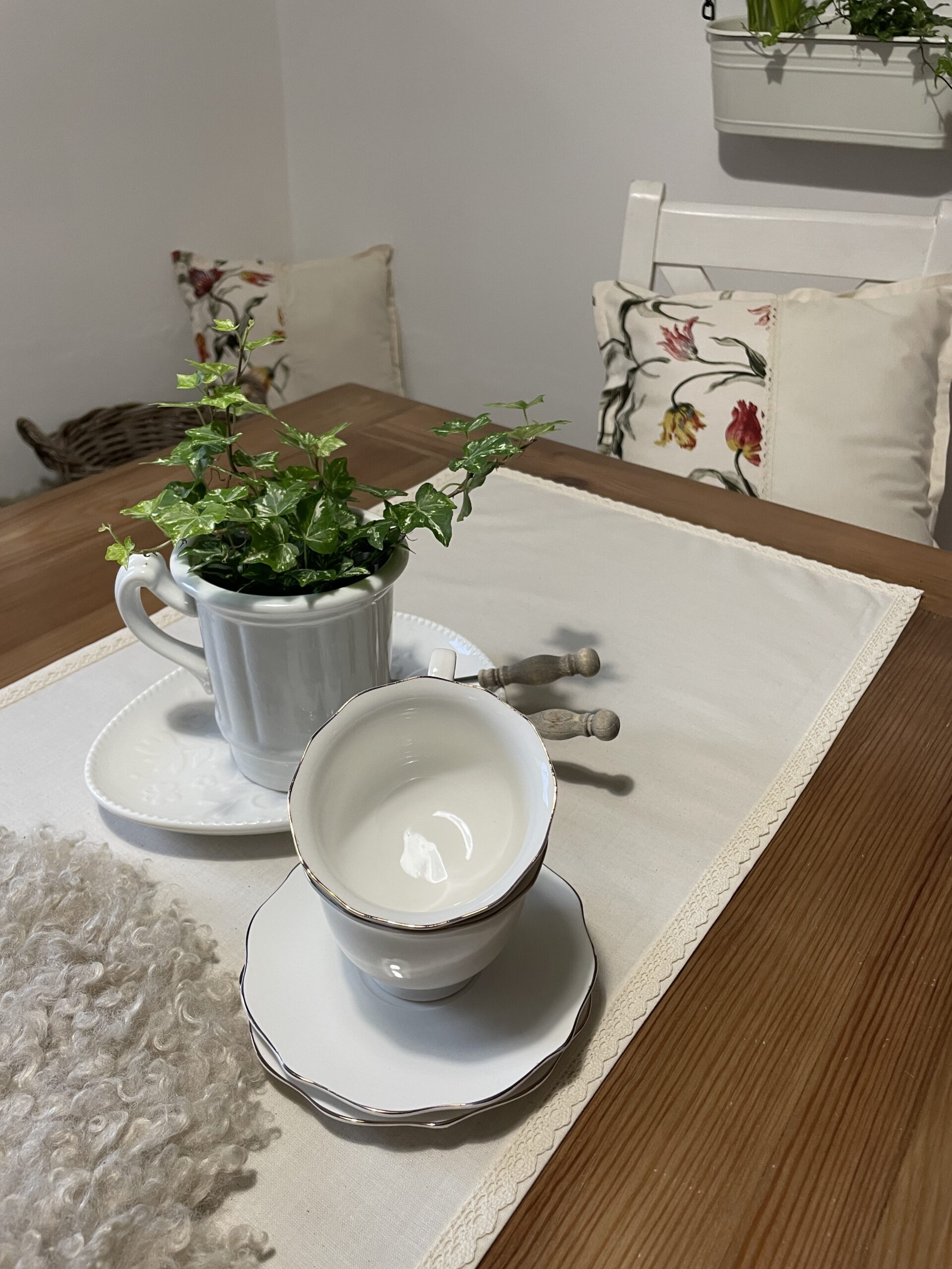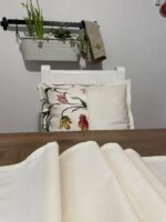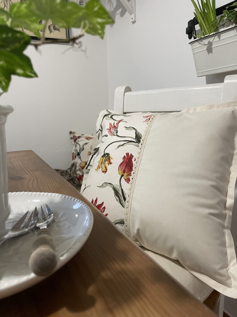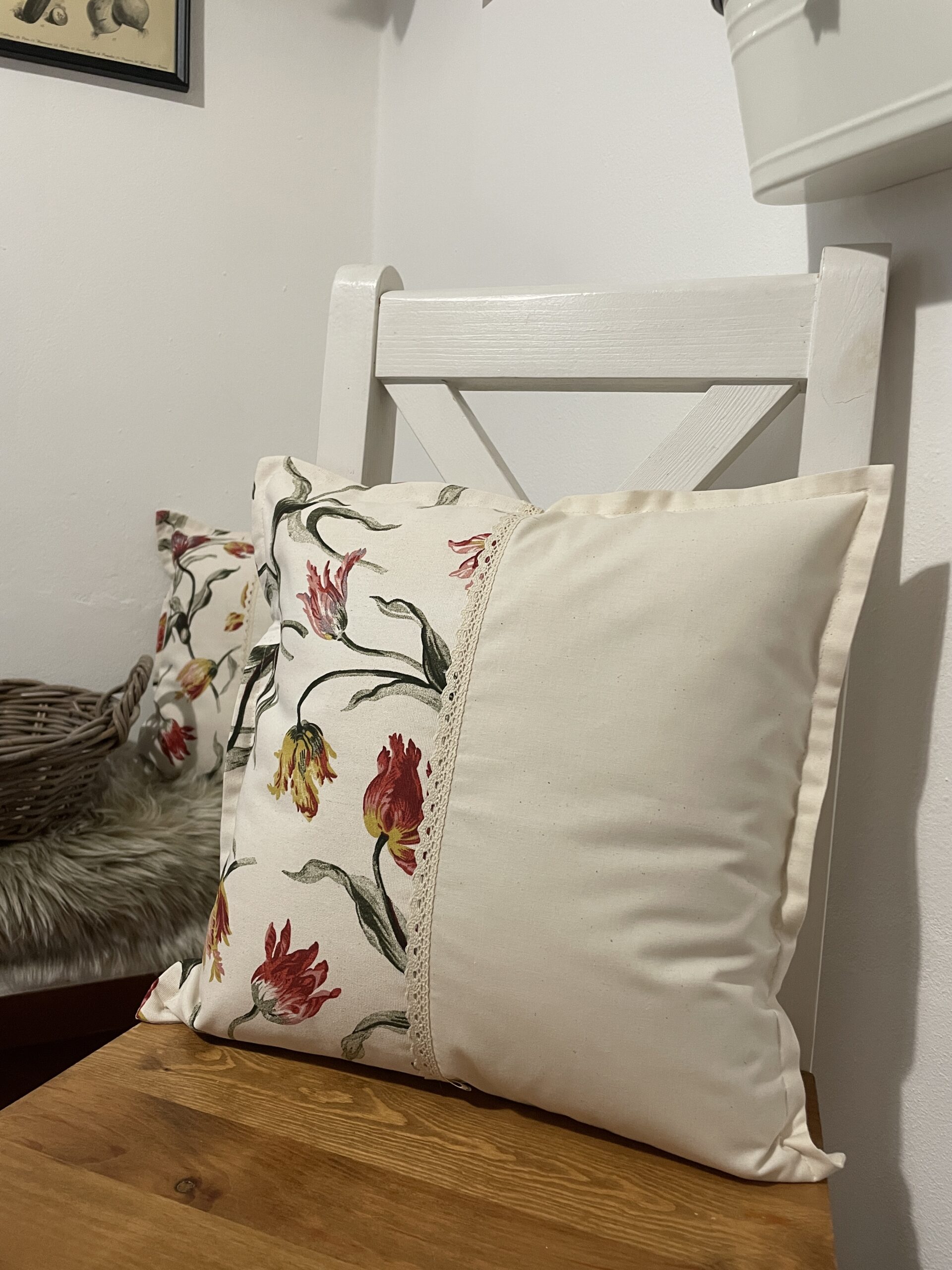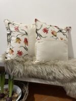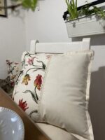 Béžový polštář zdobí našitá aplikace květin a krajky. Ozdobíte jimi křeslo, židli …. a zútulníte své oblobené místo k relaxaci.
