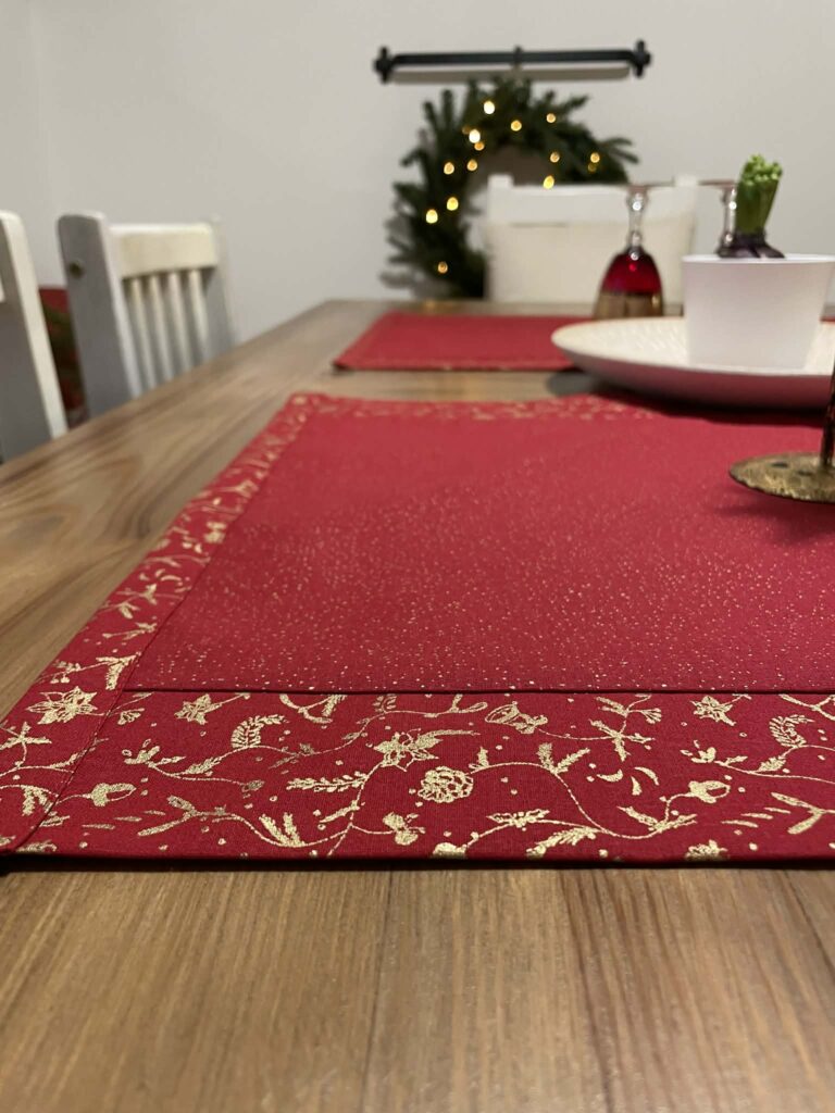 Vánoční běhoun v elegantní červené barvě se zlatým vánočním vzorem ozdobí každý stůl – samostatně, nebo v kombinaci s jednobarevným ubrusem. Je skvělý pro rychlé a efektní zútulnění interiéru. Bavlněná látka se dobře pokládá, neklouže a drží tvar. Ručně šitý doplněk, který dodá vašemu stolování jedinečné kouzlo tradičních Vánoc.