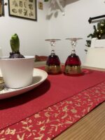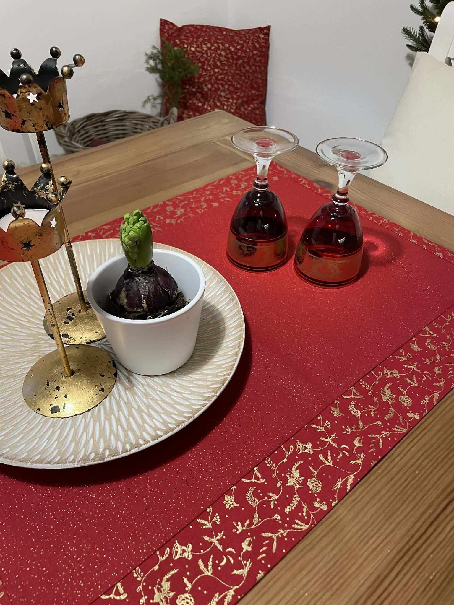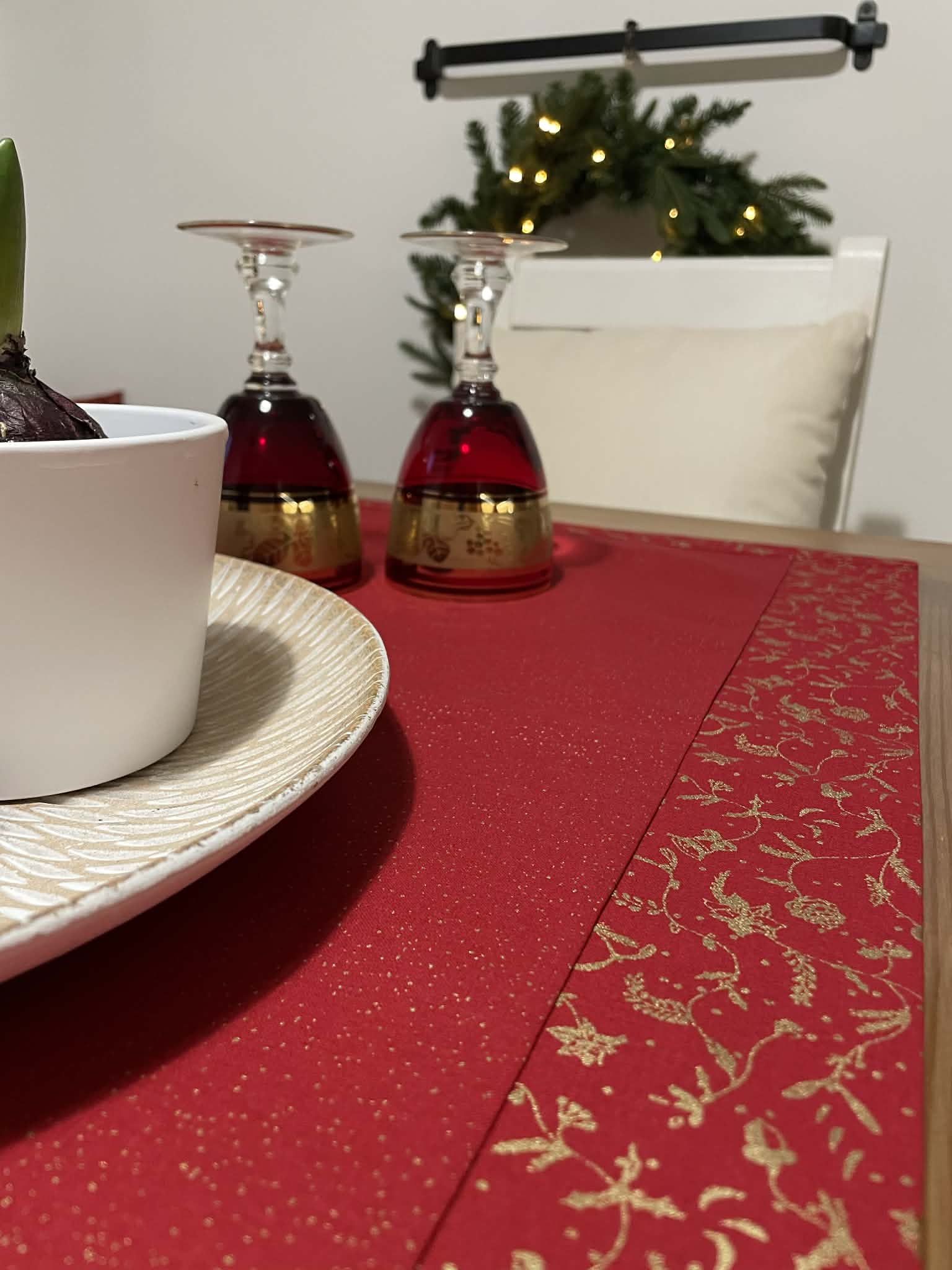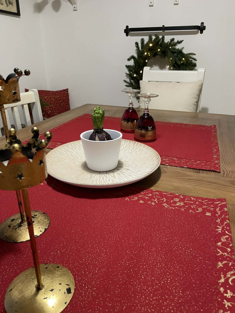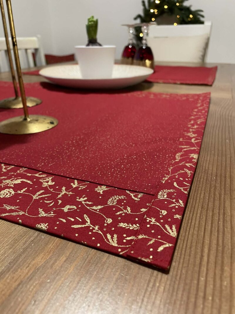 Vánoční běhoun v elegantní červené barvě se zlatým vánočním vzorem ozdobí každý stůl – samostatně, nebo v kombinaci s jednobarevným ubrusem. Je skvělý pro rychlé a efektní zútulnění interiéru. Bavlněná látka se dobře pokládá, neklouže a drží tvar. Ručně šitý doplněk, který dodá vašemu stolování jedinečné kouzlo tradičních Vánoc.