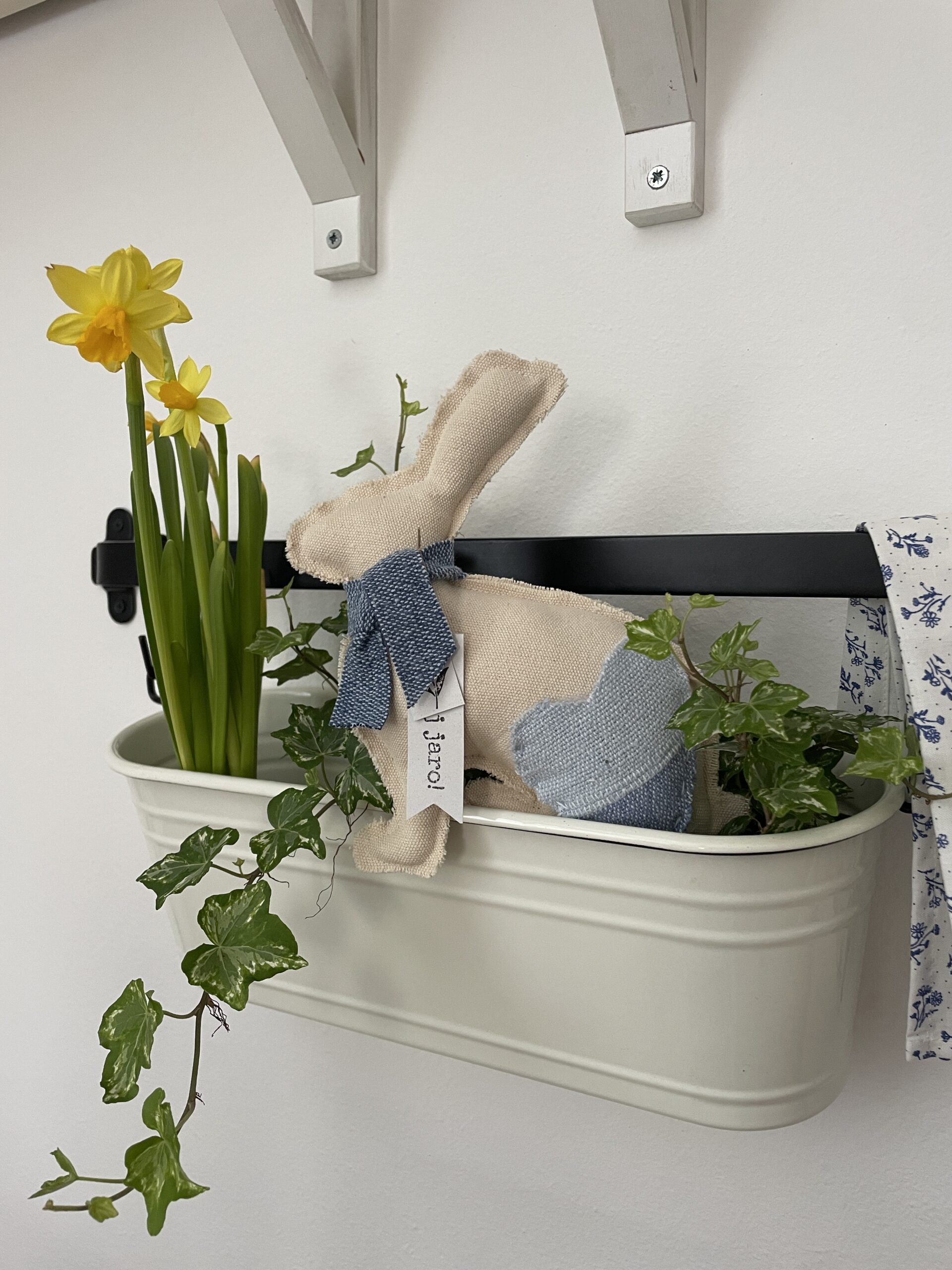 Posaďte zajíčka třeba do košíku a přidejte trochu sena a rozkvetlé cibuloviny….