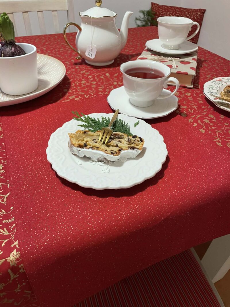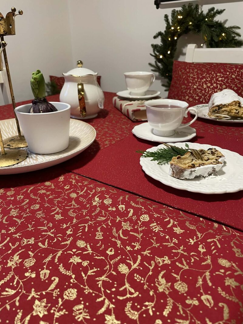 • Slavnostní vánoční ubrus červený se zlatým potiskem.